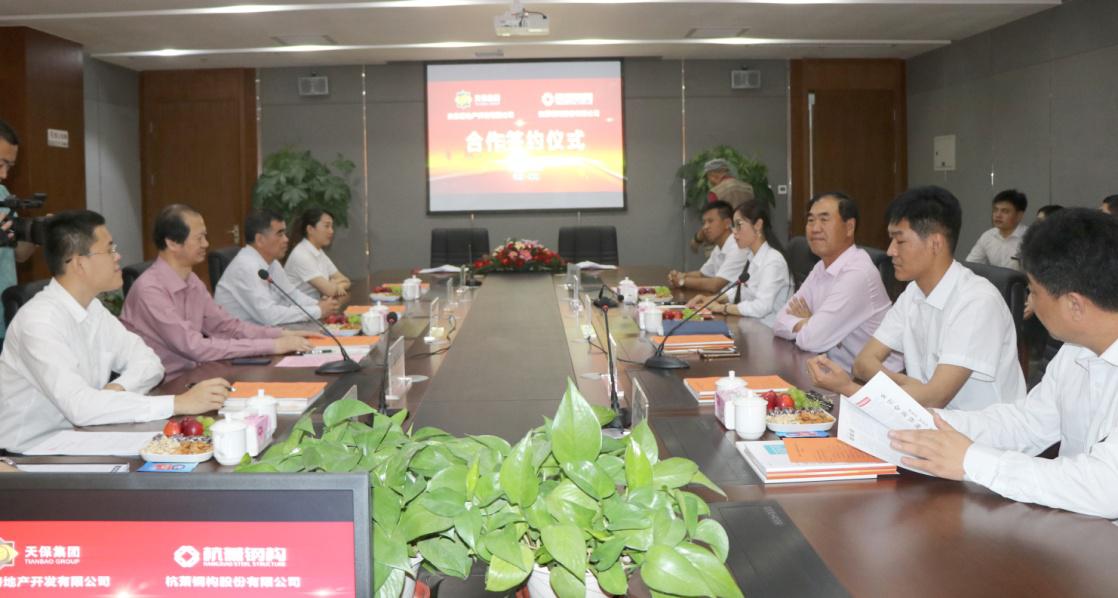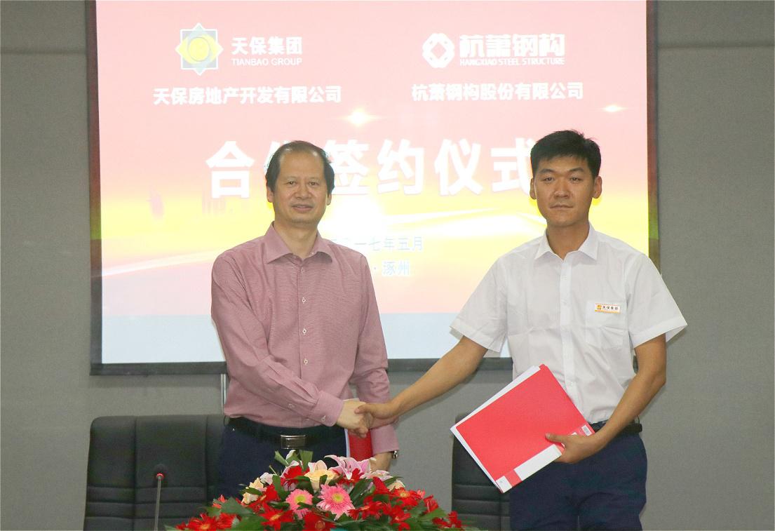 天保集團黨委書記、董事長李保田,杭蕭鋼構(gòu)董事、總裁張振勇,杭蕭鋼構(gòu)副總裁壽林平等出席杭蕭鋼構(gòu)與天保房產(chǎn)合作簽約儀式