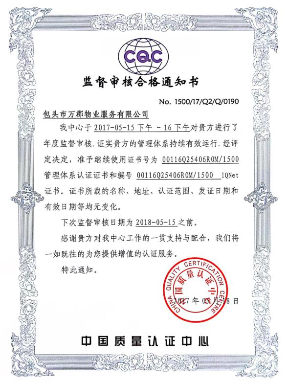 隨后審評(píng)專家開始對(duì)各部門服務(wù)流程及工作內(nèi)容進(jìn)行現(xiàn)場審核。公司各部門全力配合審評(píng)專家進(jìn)行此次年審工作,積極講解服務(wù)細(xì)則,及時(shí)為專家提供相關(guān)資料。經(jīng)過兩天的審核工作,在5月16日14:00召開末次會(huì)議,審評(píng)專家宣布,對(duì)我公司不開具工作不足整改項(xiàng)目,即各項(xiàng)工作指標(biāo)基本達(dá)到認(rèn)證要求。公司也于2017年5月22日正式收到中國質(zhì)量認(rèn)證中心發(fā)送的監(jiān)督審核合格通知書,標(biāo)志著成功通過2017年度ISO9000認(rèn)證年審,證書可繼續(xù)保持使用。