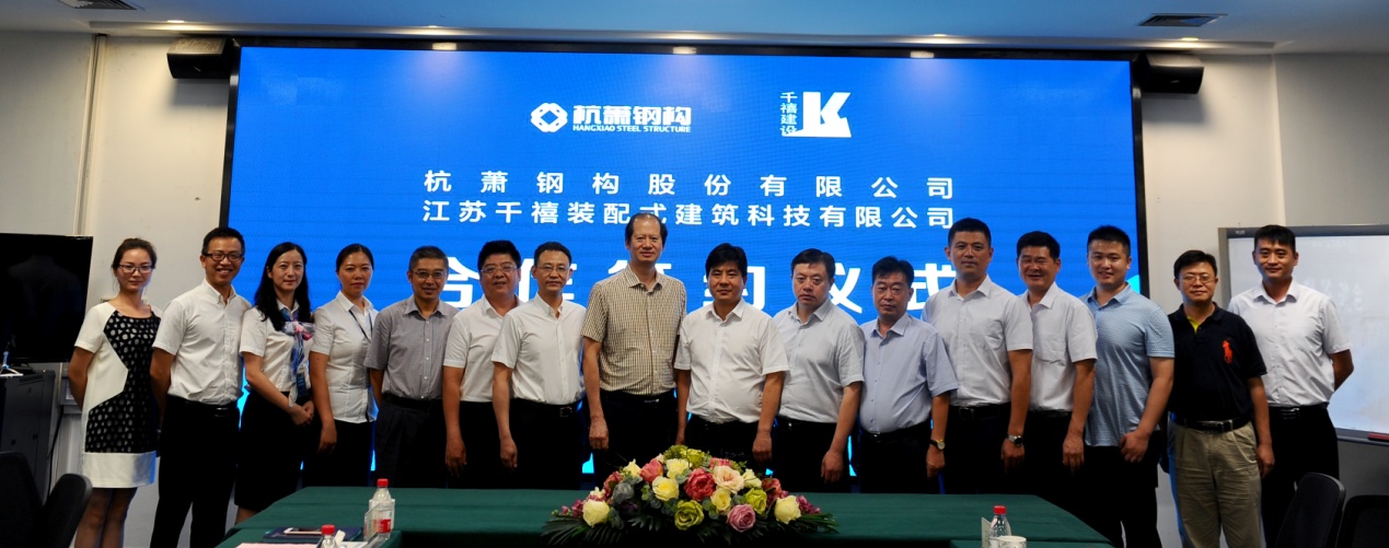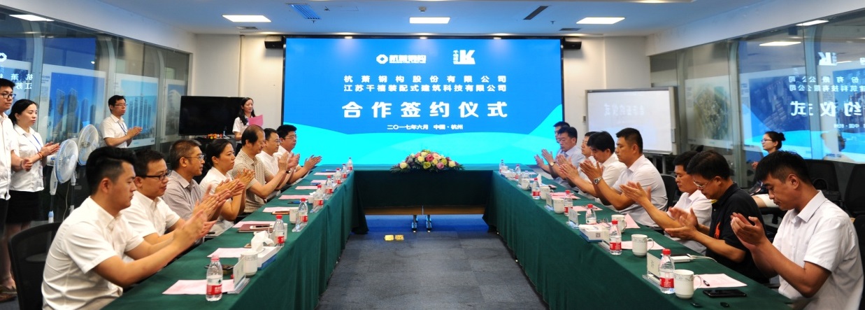 2017年6月22日,杭蕭鋼構(gòu)股份有限公司(以下簡稱:杭蕭鋼構(gòu))與江蘇千禧裝配式建筑科技有限公司(以下簡稱:江蘇千禧)在杭州正式簽署戰(zhàn)略合作協(xié)議。江蘇千禧董事長袁建華、總經(jīng)理李華、董事李來勇,杭蕭鋼構(gòu)董事、總裁張振勇,財務(wù)總監(jiān)許瓊、副總裁尤匡寶、周濱、尹衛(wèi)澤等出席簽約儀式。