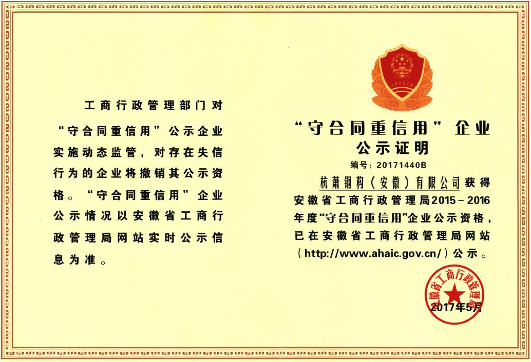近日,安徽省工商行政管理局公布了“2015—2016守合同重信用企業(yè)”名單。杭蕭鋼構(gòu)(安徽)有限公司在眾多企業(yè)中脫穎而出,再次獲得殊榮。