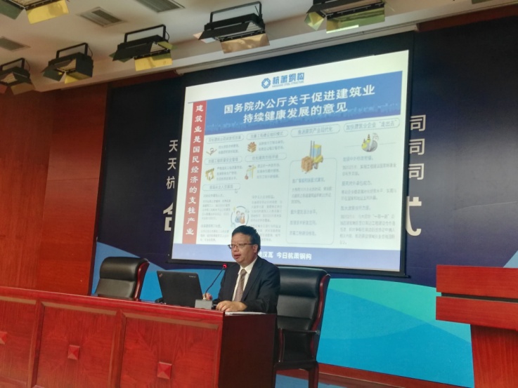 杭蕭鋼構(gòu)副總裁方鴻強介紹了裝配式鋼結(jié)構(gòu)綠色建筑集成產(chǎn)業(yè)的創(chuàng)新與實踐