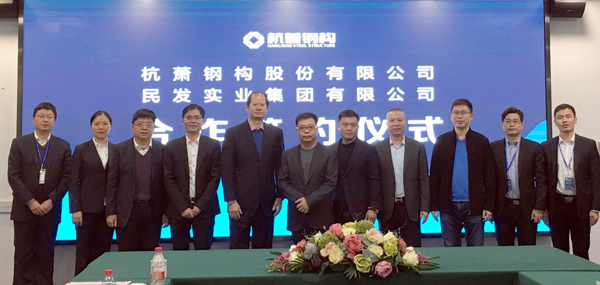 同樣在杭蕭鋼構(gòu)與民發(fā)實(shí)業(yè)的簽約儀式上,雙方表達(dá)了對合作項(xiàng)目的發(fā)展?jié)摿颓熬俺錆M信心。民發(fā)實(shí)業(yè)董事長林佺祥、副總裁陳小珂;杭蕭鋼構(gòu)總裁張振勇、常務(wù)副總裁陸擁軍、副總裁尹衛(wèi)澤等出席簽約儀式并交流。