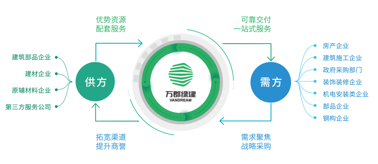 萬(wàn)郡綠建通過(guò)透明交易、一站式采購(gòu)、信息與大數(shù)據(jù)共享為采購(gòu)降低成本,提高效率;通過(guò)全方位展示、多樣化互動(dòng)、供應(yīng)鏈金融為供應(yīng)商拓寬渠道,提升商譽(yù)。同時(shí)萬(wàn)郡綠建通過(guò)線上網(wǎng)站、交易平臺(tái)、產(chǎn)品體驗(yàn)中心和公眾號(hào)三大服務(wù)平臺(tái)為專(zhuān)業(yè)的供應(yīng)鏈供需方交易保駕護(hù)航。