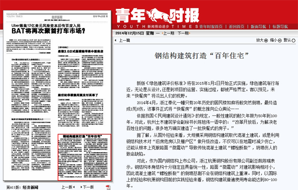 2014年12月15日,《青年時(shí)報(bào)》第A11版《經(jīng)濟(jì)新聞》報(bào)道:《鋼結(jié)構(gòu)建筑打造“百年住宅”》。