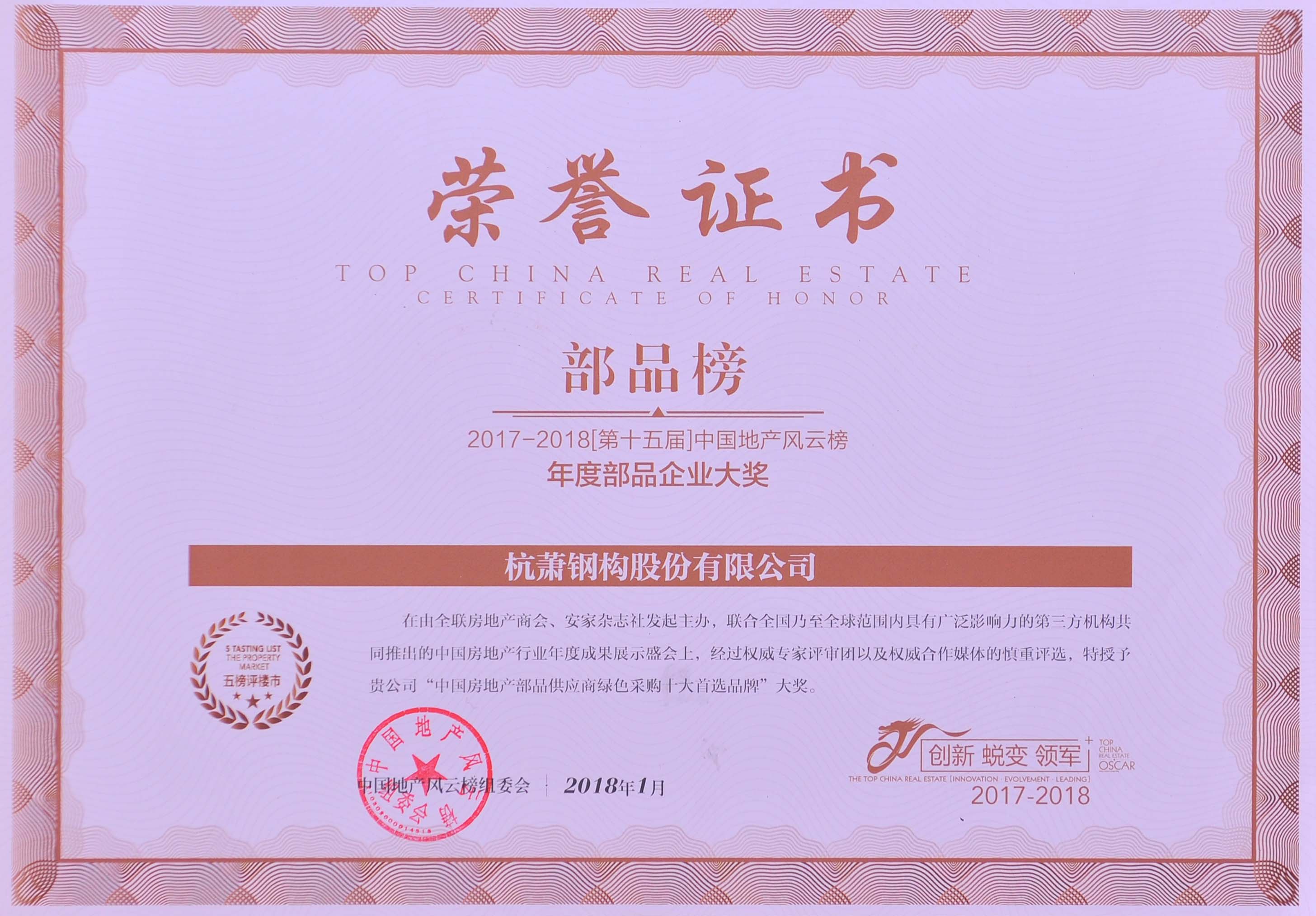 ▲杭蕭鋼構(gòu)三年蟬聯(lián)“中國房地產(chǎn)部品供應(yīng)商綠色采購十大首選品牌”