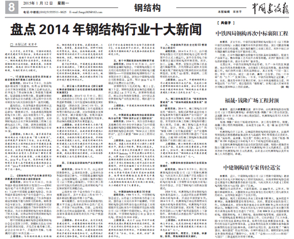 2015年1月12日,《中國建設報》第8版《鋼結構》報道:《盤點2014年鋼結構行業(yè)十大新聞》。