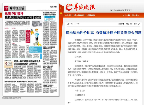 2015年1月21日,《羊城晚報(bào)》第A24版《珠中江生活》報(bào)道:《鋼構(gòu)結(jié)構(gòu)性價(jià)比高 有效解決棚戶區(qū)改造資金問(wèn)題》。