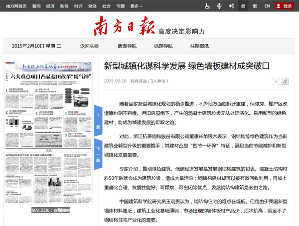 2015年2月10日《南方日報》第A03版《深圳觀察》報道:《新型城鎮(zhèn)化謀科學發(fā)展 綠色墻板建材成突破口》。