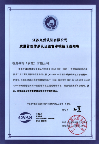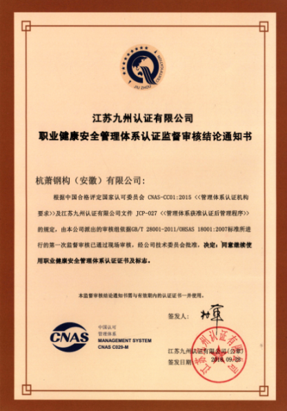 近日,江蘇九州認(rèn)證有限公司審核組蒞臨杭蕭鋼構(gòu)股份有限公司(以下簡(jiǎn)稱“杭蕭鋼構(gòu)”)全資子公司——杭蕭鋼構(gòu)(安徽)有限公司(以下簡(jiǎn)稱“安徽杭蕭”),對(duì)安徽杭蕭質(zhì)量、環(huán)境、職業(yè)健康安全管理體系進(jìn)行監(jiān)督審核認(rèn)證。