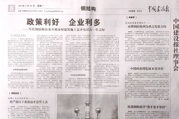 2015年3月16日,《中國(guó)建設(shè)報(bào)》第8版《鋼結(jié)構(gòu)》報(bào)道:《政策利好 企業(yè)利多——寫在鋼結(jié)構(gòu)企業(yè)開展房屋建筑施工總承包試點(diǎn)一年之際》。