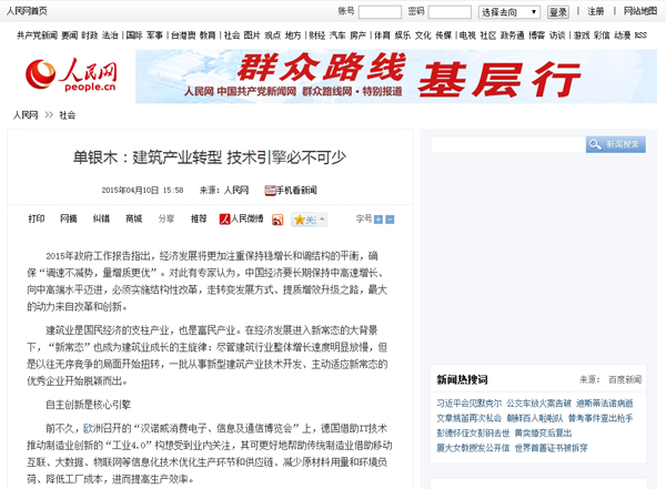 2015年4月10日,《人民網(wǎng)》新聞頻道首頁報道:《單銀木:建筑產(chǎn)業(yè)轉(zhuǎn)型 技術(shù)引擎必不可少》。