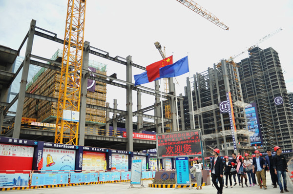 2015年4月23日,業(yè)內(nèi)專家、記者在參觀杭蕭鋼構(gòu)施工現(xiàn)場。新華社發(fā) 趙生祥 攝