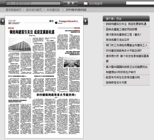 2015年5月5日,《中華建筑報(bào)》第07版《綜合》報(bào)道:《鋼結(jié)構(gòu)建筑引關(guān)注 或迎發(fā)展新機(jī)遇》。