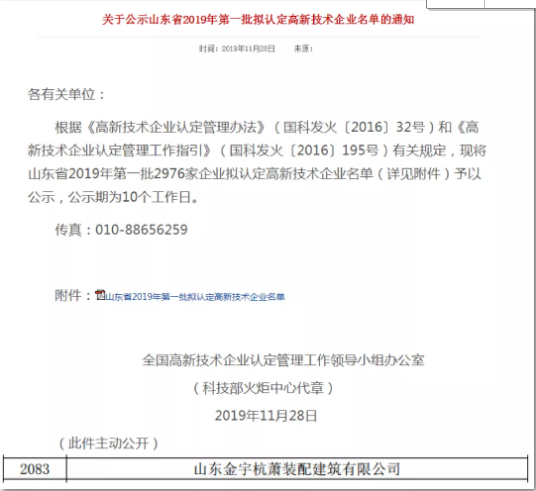 山東金宇杭蕭獲評2019年山東省第一批認定高新技術(shù)企業(yè)