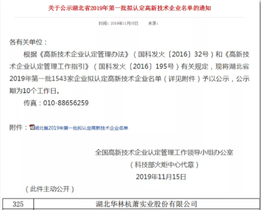 湖北華林杭蕭獲評2019年湖北省第一批認定高新技術(shù)企業(yè)