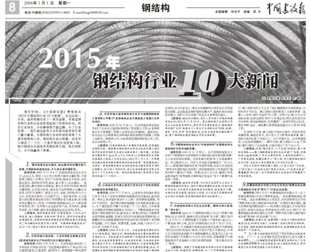 2016年1月1日,《中國(guó)建設(shè)報(bào)》在《鋼結(jié)構(gòu)》版發(fā)布了“2015年鋼結(jié)構(gòu)行業(yè)10大新聞”,杭蕭鋼構(gòu)入圍