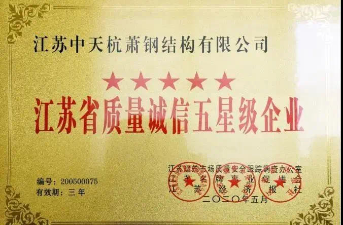 近日,由江蘇建筑市場質(zhì)量安全跟蹤調(diào)查辦公室聯(lián)合江蘇名牌事業(yè)促進會公布了2020年江蘇省質(zhì)量誠信五星企業(yè)名單,杭蕭鋼構(gòu)戰(zhàn)略合作參股公司——江蘇中天杭蕭鋼構(gòu)有限公司(以下簡稱“江蘇中天杭蕭”)榜上有名,被授予“江蘇省質(zhì)量誠信五星企業(yè)”榮譽稱號。