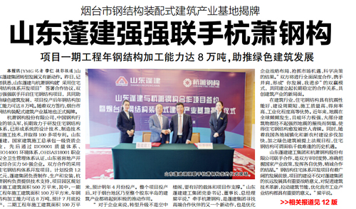 2016年4月22日,《煙臺(tái)日?qǐng)?bào)》第01版報(bào)道:《煙臺(tái)市鋼結(jié)構(gòu)裝配式建筑產(chǎn)業(yè)基地揭牌?山東蓬建強(qiáng)強(qiáng)聯(lián)手杭蕭鋼構(gòu)?項(xiàng)目一期工程年鋼結(jié)構(gòu)加工能力達(dá)8萬噸,助推綠色建筑發(fā)展》