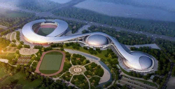 平?jīng)鍪畜w育運(yùn)動(dòng)公園項(xiàng)目由中交第二公路工程有限公司總承包,占地面積450畝,總建筑面積90419平方米。設(shè)計(jì)方案以“星河璀璨、絲路延綿”為主題,采用“一帶三館”布局,表達(dá)了“絲路文化”以及崆峒八卦文化的內(nèi)涵。