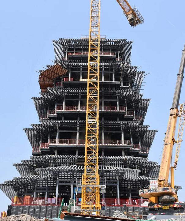 ?江蘇中天杭蕭施工建造的徐州市石山消防瞭望塔(呂梁閣)項目總建筑面積約4135㎡,地下建筑面積1183㎡,地上建筑面積2952㎡。本工程地上共七層,地下一層,結(jié)構(gòu)形式為混凝土核心筒剪力墻+鋼框架結(jié)構(gòu),基礎(chǔ)為平板式筏板基礎(chǔ)。結(jié)構(gòu)中心設(shè)置混凝土剪力墻筒體,核心筒高度升至屋面。整體結(jié)構(gòu)南北向40.2m,東西向35.2m。基礎(chǔ)標高為-6.850m。結(jié)構(gòu)共計7層檐口,其中檐口鋼椽約2100余件,桁架梁約1300余件,鋼梁約1500余件,鋼柱約300余件。