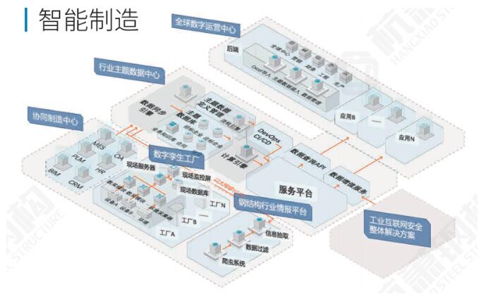 同時,加快“未來工廠”平臺建設(shè)腳步,構(gòu)建工業(yè)互聯(lián)網(wǎng)工廠端生產(chǎn)數(shù)字化管理系統(tǒng)。通過信息化手段重構(gòu)生產(chǎn)組織模式,對內(nèi)實現(xiàn)數(shù)字化管理和資源優(yōu)化配置,對外提供接單和產(chǎn)能數(shù)字化接口,逐步形成以鋼結(jié)構(gòu)產(chǎn)業(yè)大腦為調(diào)度核心的網(wǎng)絡(luò)協(xié)同化制造生態(tài)圈。