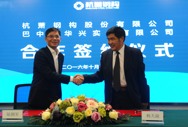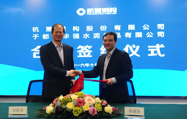 ↑杭蕭鋼構(gòu)總裁張振勇與于都華強(qiáng)董事長鄢建強(qiáng)共同簽署戰(zhàn)略合作協(xié)議。