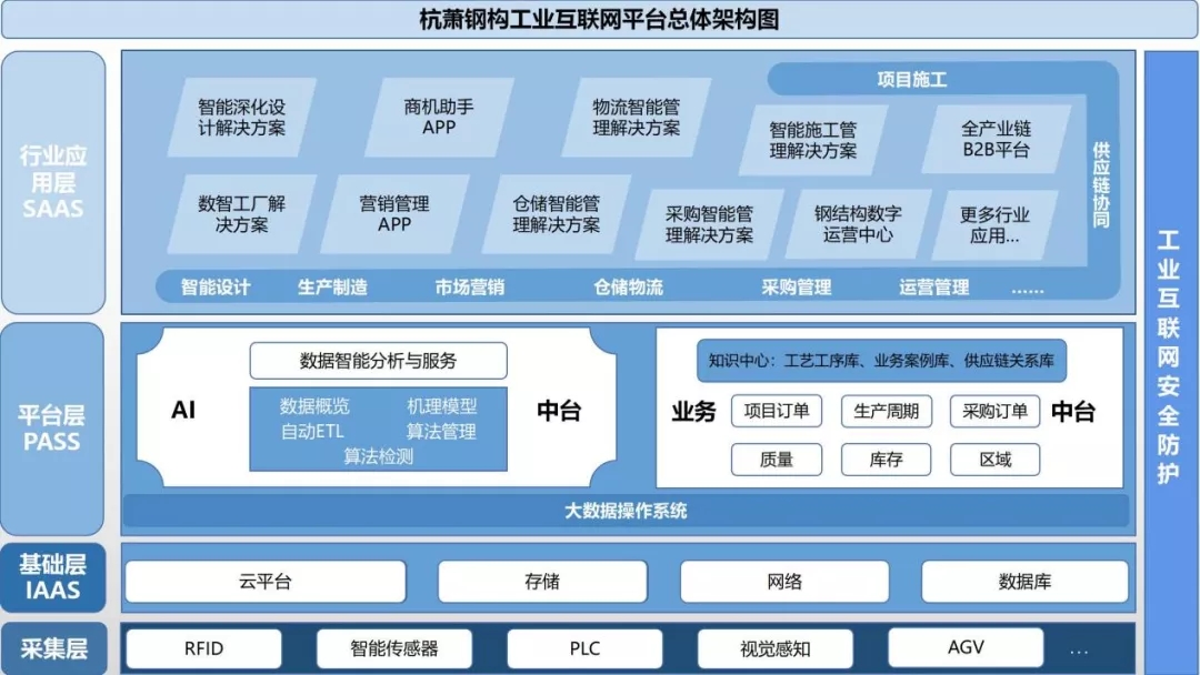 杭蕭鋼構(gòu)工業(yè)互聯(lián)網(wǎng)平臺主要包括鋼結(jié)構(gòu)數(shù)字運營中心、數(shù)智工廠、協(xié)同制造平臺、行業(yè)情報中心、數(shù)據(jù)智能分析與服務(wù)平臺、工業(yè)大數(shù)據(jù)操作系統(tǒng)、工業(yè)互聯(lián)網(wǎng)安全整體解決方案等7大解決方案39個功能模塊。
