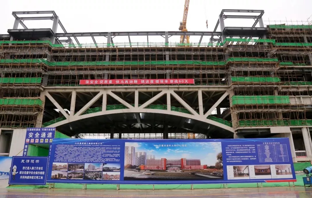 日照市老年大學(xué)EPC項(xiàng)目位于山東省日照市,總用地面積28.5畝,總建筑面積3.91萬㎡,分為2棟教學(xué)樓、1棟體育館、1棟報(bào)告廳三個(gè)單體。其中教學(xué)樓地下一層,地上6層,房屋高度26.4m,采用鋼框架結(jié)構(gòu);體育館地上2層,房屋高度12.5m;報(bào)告廳地上2層,房屋高度15.4m。該項(xiàng)目于2021年4月開工,同年11月完成結(jié)構(gòu)封頂。