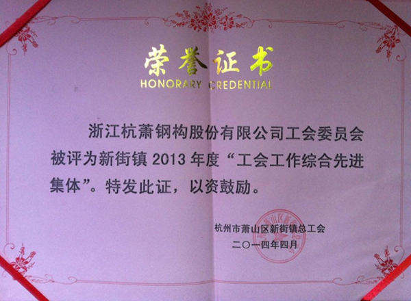 近日,新街鎮(zhèn)總工會召開了2013年度工會工作先進(jìn)集體和先進(jìn)個人表彰大會,浙江杭蕭鋼構(gòu)股份有限公司工會被評為2013年度“工會工作綜合先進(jìn)集體”,職工黃志偉被評為2013年度“優(yōu)秀職工”稱號。