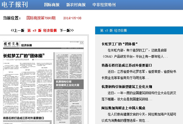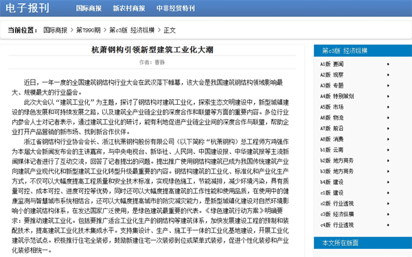 2014年5月8日,《國際商報》C3版《經(jīng)濟(jì)縱橫》報道:《杭蕭鋼構(gòu)引領(lǐng)新型建筑工業(yè)化大潮》。