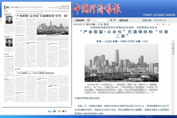 2014年5月14日,《中國經(jīng)濟導報》第B02版《產(chǎn)業(yè)·投資》報道:《“產(chǎn)業(yè)聯(lián)盟+總承包”打通鋼結(jié)構(gòu)“任督二脈”》。