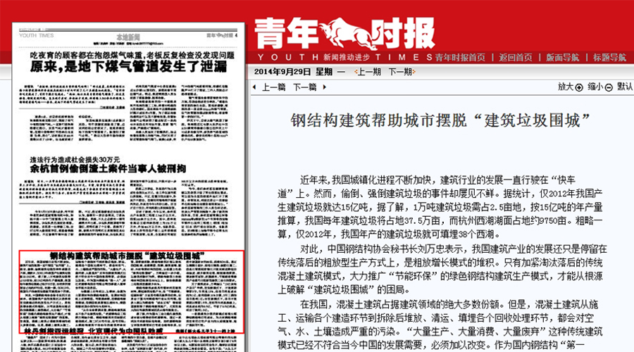 2014年9月29日,《青年時(shí)報(bào)》第A04版《本地新聞》報(bào)道:《鋼結(jié)構(gòu)建筑幫助城市擺脫“建筑垃圾圍城”》。
