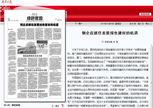 2014年10月9日,《科技日報》第12版《綠色家園》報道:《鋼企應(yīng)抓住發(fā)展綠色建材的機(jī)遇》。