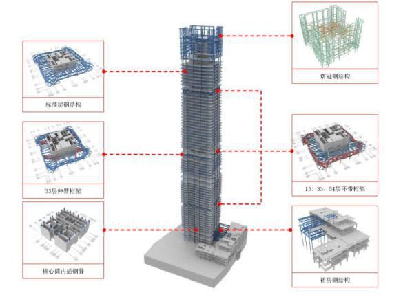 該工程鋼結(jié)構(gòu)設計涵蓋了伸臂桁架、環(huán)帶桁架、勁性混凝土柱、鋼管混凝土柱、鋼板剪力墻、空間結(jié)構(gòu)塔冠和超薄鋼筋桁架樓層板等各種結(jié)構(gòu),設計復雜,施工難度大;成為漢德邦建材2020年首個鋼筋桁架樓承板重點代表性項目。