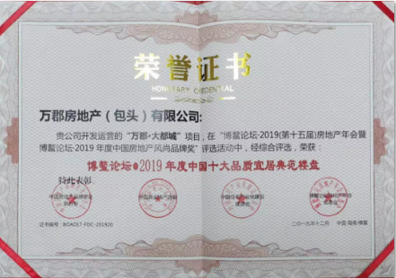 博鰲論壇·2019年度中國(guó)十大品質(zhì)宜居典范樓盤(pán)榮譽(yù)證書(shū)