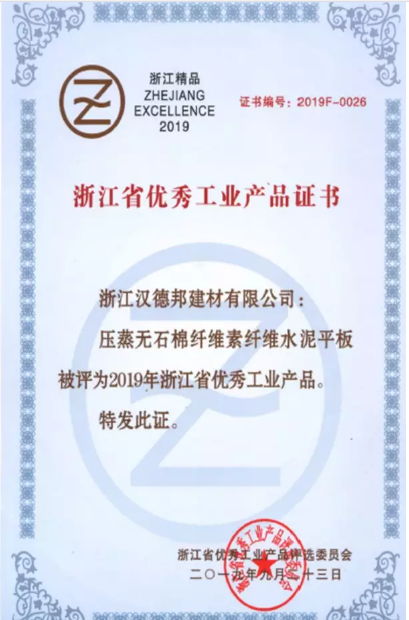 近日,由浙江省企業(yè)聯(lián)合會(huì)、浙江省企業(yè)家協(xié)會(huì)、浙江省工業(yè)經(jīng)濟(jì)聯(lián)合會(huì)主辦的“2019浙江省企業(yè)領(lǐng)袖峰會(huì)暨企業(yè)家活動(dòng)日”在杭州舉行。會(huì)上正式揭曉了2019年度“浙江省優(yōu)秀工業(yè)產(chǎn)品”評(píng)選的相關(guān)結(jié)果。浙江漢德邦建材有限公司(以下簡(jiǎn)稱“漢德邦建材”)生產(chǎn)的壓蒸無(wú)石棉纖維素纖維水泥板(CCA板)榮獲“浙江省優(yōu)秀工業(yè)產(chǎn)品”證書。
