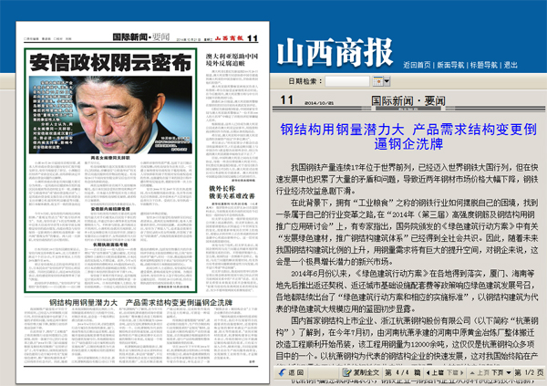 2014年10月21日,《山西商報》第11版《國際新聞·要聞》報道:《鋼結構用鋼量潛力大 產(chǎn)品需求結構變更倒逼鋼企洗牌》。