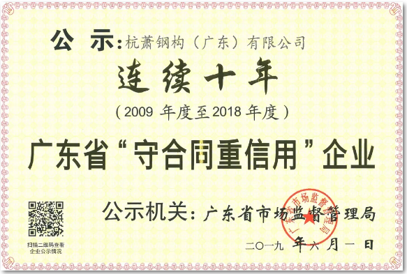 近日,廣東省市場監(jiān)督管理局公布了2018年度廣東省“守合同重信用”企業(yè)名單,杭蕭鋼構(gòu)(廣東)有限公司(以下簡稱“廣東杭蕭”)憑借良好的社會信譽與綜合實力,再次獲評廣東省“守合同重信用企業(yè)”稱號。