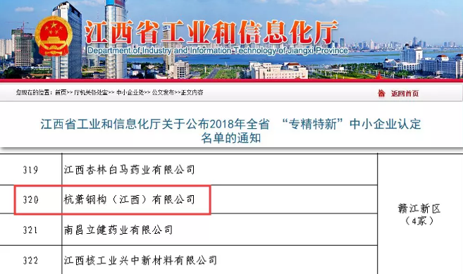 近日,在經(jīng)過第三方機構(gòu)的審核推薦、專家組評審等數(shù)道程序之后,江西省工業(yè)和信息化廳公布了2018年全省“專精特新”中小企業(yè)認定名單,其中,杭蕭鋼構(gòu)(江西)有限公司(以下簡稱“江西杭蕭”)榜上有名,作為唯一一家鋼結(jié)構(gòu)企業(yè)獲此殊榮。