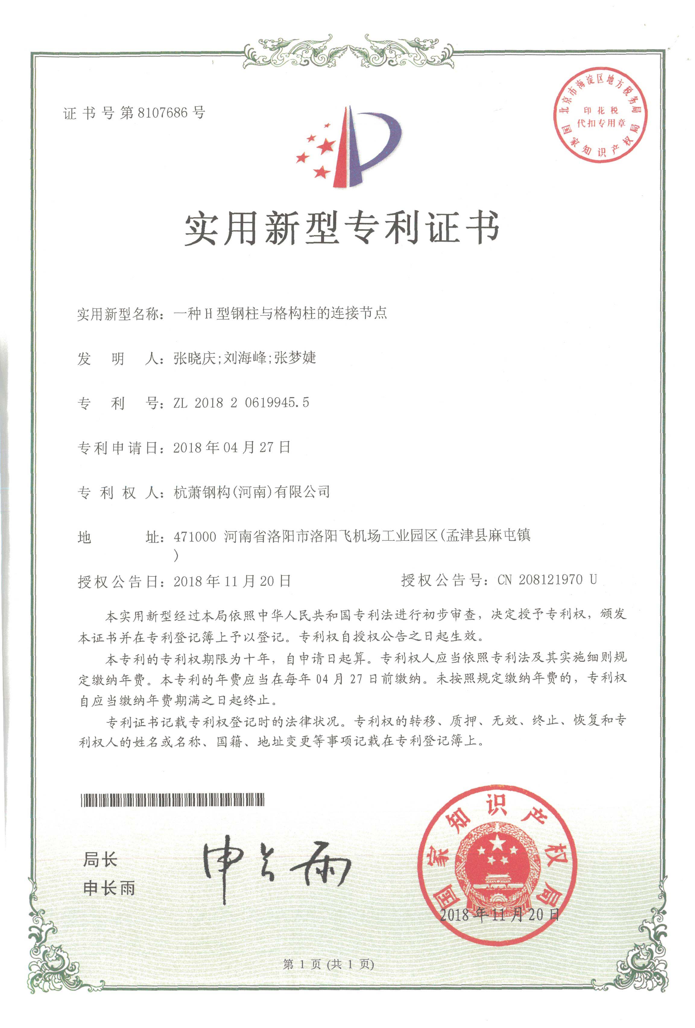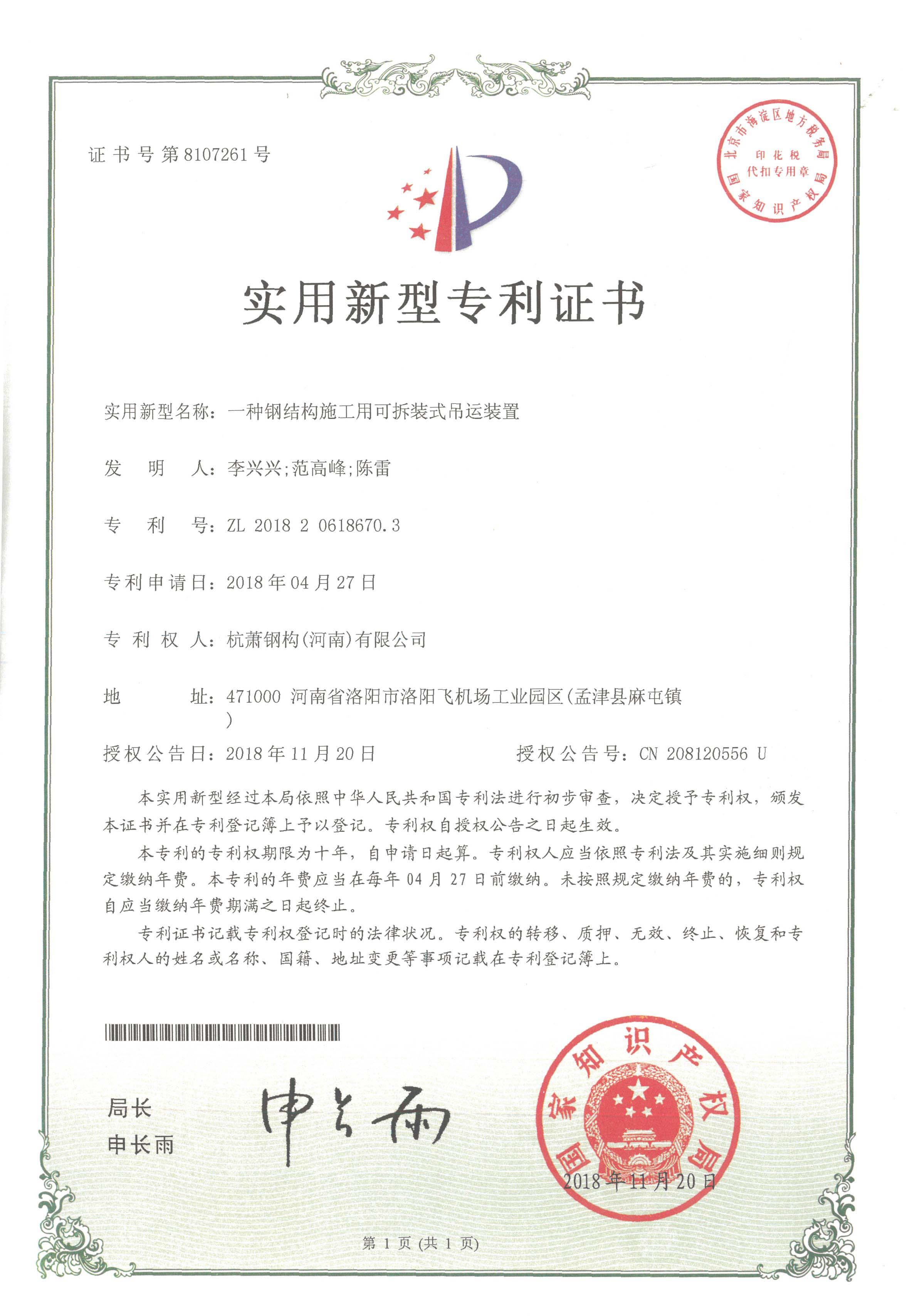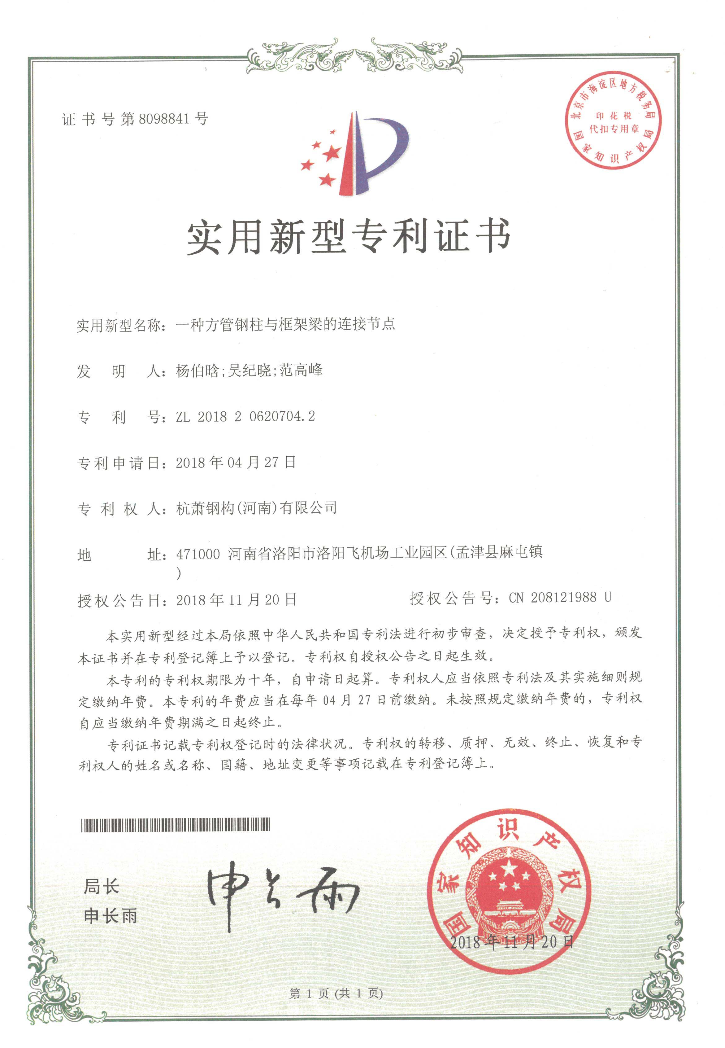 近日,杭蕭鋼構(gòu)股份有限公司(以下簡稱“杭蕭鋼構(gòu)”)全資子公司——杭蕭鋼構(gòu)(河南)有限公司(以下簡稱“河南杭蕭”)申請的“一種鋼結(jié)構(gòu)桁架雨棚”、“一種H型鋼柱與格構(gòu)柱的連接節(jié)點”、“一種方管鋼柱與框架梁的連接節(jié)點”及“一種鋼結(jié)構(gòu)施工用可拆裝式吊運裝置”共四項實用新型專利,經(jīng)中華人民共和國國家知識產(chǎn)權(quán)局專利審查局嚴格審查,獲得授權(quán)證書。