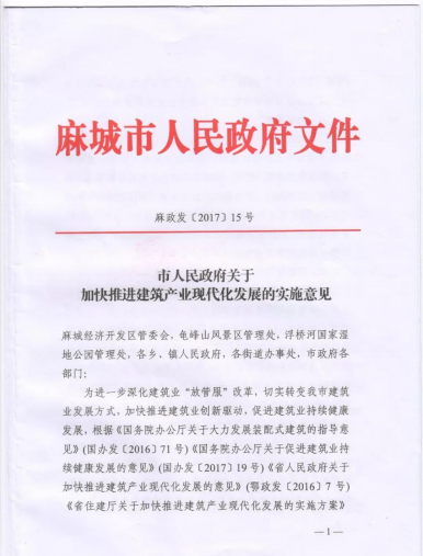 推進(jìn)建筑產(chǎn)業(yè)現(xiàn)代化,大力發(fā)展鋼結(jié)構(gòu)和裝配式建筑,是黨中央、國(guó)務(wù)院作出的重大決策,麻城市政府根據(jù)國(guó)務(wù)院和相關(guān)部委、湖北省政府的產(chǎn)業(yè)政策,于2017年9月出臺(tái)了《關(guān)于加快推進(jìn)建筑產(chǎn)業(yè)現(xiàn)代化的實(shí)施意見(jiàn)》的文件,對(duì)于麻城市建筑產(chǎn)業(yè)結(jié)構(gòu)升級(jí)、建筑產(chǎn)業(yè)現(xiàn)代化的發(fā)展作出了明確部署和要求,確定以城區(qū)為龍頭,以政府投資項(xiàng)目為重點(diǎn),以裝配式建筑技術(shù)作為主要實(shí)現(xiàn)形式,支持企業(yè)投資建設(shè)建筑產(chǎn)業(yè)現(xiàn)代化基地,開(kāi)展建筑產(chǎn)業(yè)現(xiàn)代化項(xiàng)目應(yīng)用試點(diǎn)。