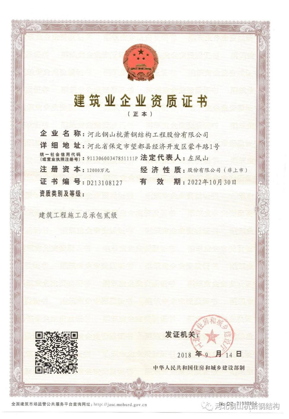 近日,杭蕭鋼構(gòu)股份有限公司(以下簡(jiǎn)稱“杭蕭鋼構(gòu)”)戰(zhàn)略合作參股公司——河北鋼山杭蕭鋼結(jié)構(gòu)工程股份有限公司(以下簡(jiǎn)稱“河北鋼山杭蕭”)經(jīng)過(guò)公司全體員工的團(tuán)結(jié)努力,正式獲得河北省住房和城鄉(xiāng)建設(shè)廳頒發(fā)的《建筑工程施工總承包二級(jí)資質(zhì)證書》,順利榮升為建筑工程施工總承包二級(jí)企業(yè)。