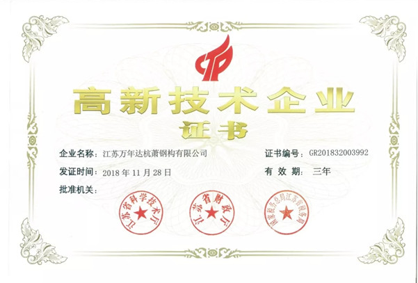 近日,江蘇萬年達(dá)杭蕭鋼構(gòu)有限公司正式收到了是由江蘇省科學(xué)技術(shù)廳、江蘇省財政廳、江蘇省稅務(wù)局聯(lián)合頒發(fā)的高新技術(shù)企業(yè)證書。
