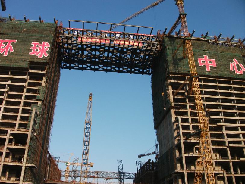 ??? 由我司施工的成都新世紀(jì)環(huán)球中心東二區(qū)屋面連廊桁架(總重量2700噸,目前西南地區(qū)整體提升重量最大的鋼結(jié)構(gòu)工程),在公司總裁肖作國、總工楊強(qiáng)躍、項(xiàng)目運(yùn)行總監(jiān)王慶禮的領(lǐng)導(dǎo)和指揮下于8月23日晚順利提升到位。