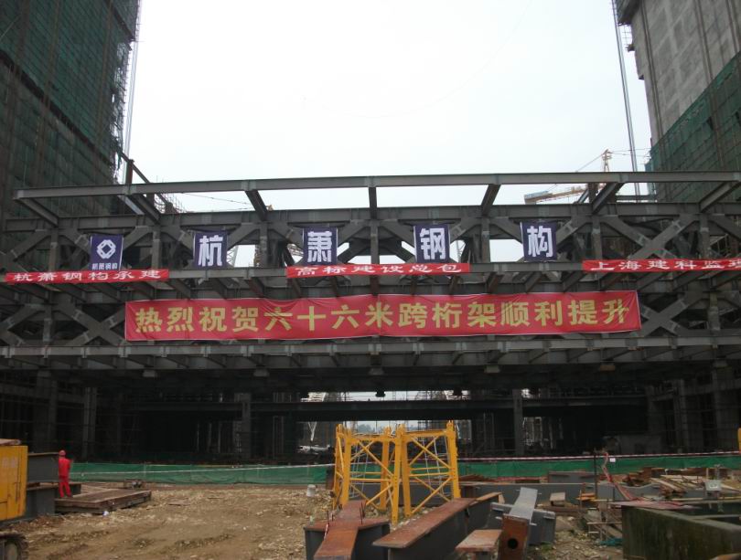 ?? ?此次提升的屋面連廊桁架梁頂標(biāo)高105.2m,下弦底標(biāo)高93.25m,跨度66m,寬度31m。地下室及兩側(cè)大樓已經(jīng)先期施工、交叉作業(yè)面多、場地狹窄、工期緊,設(shè)計(jì)變更多,施工難度大,常規(guī)的鋼結(jié)構(gòu)安裝方法是不可能完成任務(wù)的,所以連廊桁架在一層樓面整體拼裝后采用獨(dú)創(chuàng)的倒裝累積液壓整體提升法工藝施工。該工藝施工技術(shù)先進(jìn)、工藝成熟,在塔吊等常規(guī)起重設(shè)備不能滿足鋼結(jié)構(gòu)安裝要求的情況下,液壓整體提升不但解決了安裝難題,且節(jié)約了安裝時(shí)間及措施費(fèi)用,解決了由于交叉施工帶來的相互影響的施工問題。