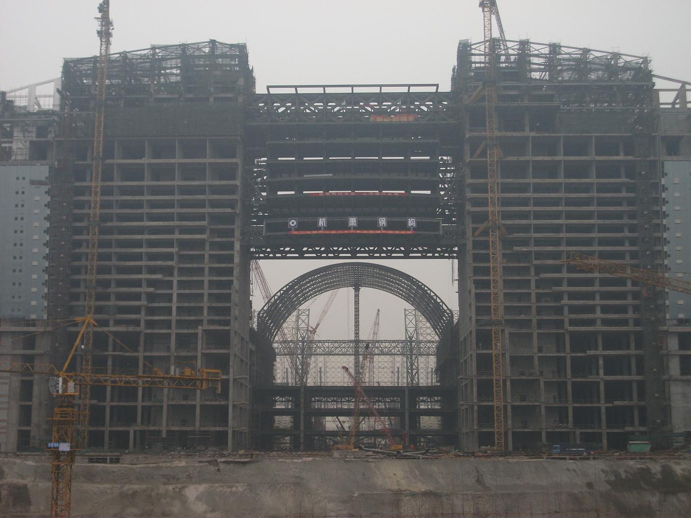??? 成都新世紀(jì)環(huán)球中心東二區(qū)連廊——屋面桁架、16-18層鋼框架、13-14層桁架,總重量5700噸。 13層梁最低處標(biāo)高59.1米,屋面桁架梁頂標(biāo)高105.2米,共計高度46.1米,為國內(nèi)重量最大、高度最高的連廊。