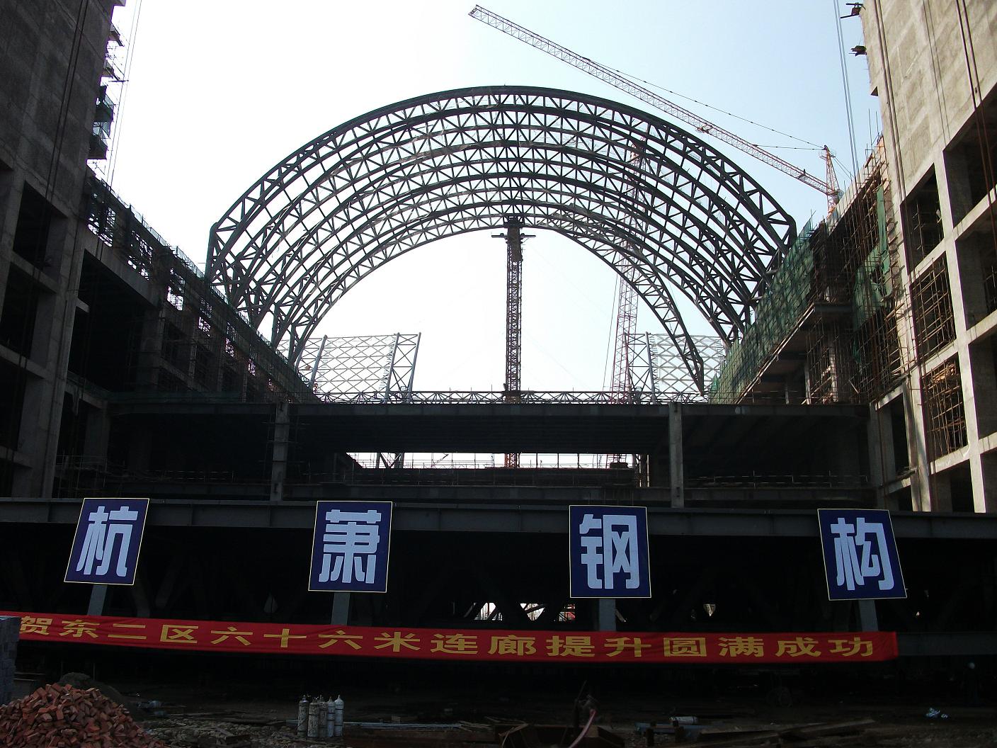 ??? 13~14層連廊桁架的成功提升,為本項目的連廊施工畫上了一個圓滿的句號。成都新世紀(jì)環(huán)球中心東二區(qū)66米跨連廊安裝,是我司有史以來,在無技術(shù)外援的情況下,單次提升重量最大,同部位提升次數(shù)最多的鋼結(jié)構(gòu)工程。我司采用的倒裝累積提升施工工藝,刷新了國內(nèi)建筑業(yè)的新紀(jì)錄。此項目的成功實施,顯示了我公司在鋼結(jié)構(gòu)行業(yè)領(lǐng)頭羊的實力。