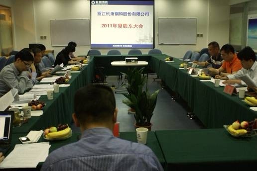 5月4日上午9點(diǎn),杭蕭鋼構(gòu)2011年年度股東大會(huì)在瑞豐大廈五樓召開(kāi),出席本次大會(huì)的有公司股東、董事、監(jiān)事、高級(jí)管理人員及公司聘請(qǐng)的律師,會(huì)議由董事長(zhǎng)單銀木先生主持。