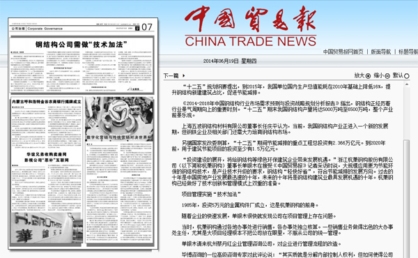 2014年6月19日,《中國貿(mào)易報》第七版《公司治理》報道:《鋼結(jié)構(gòu)公司需做“技術(shù)加法”》。