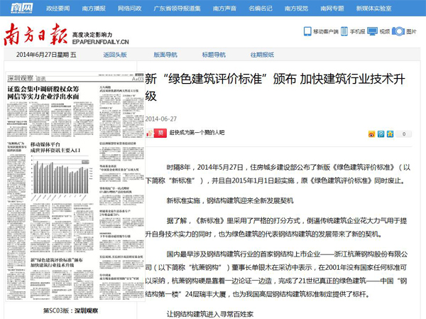 2014年6月27日,《南方日?qǐng)?bào)》A03版《深圳觀察》報(bào)道:《新“綠色建筑評(píng)價(jià)標(biāo)準(zhǔn)”頒布 加快建筑行業(yè)技術(shù)升級(jí)》